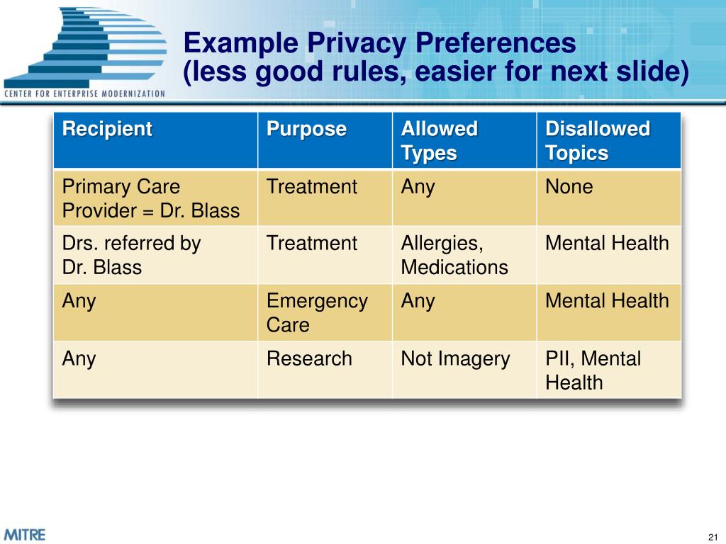 Preference Simplification(through Rule Minimization) Dr. Walsh: Purpose = Treatment (Medications or Allergies) and not Mental Health
