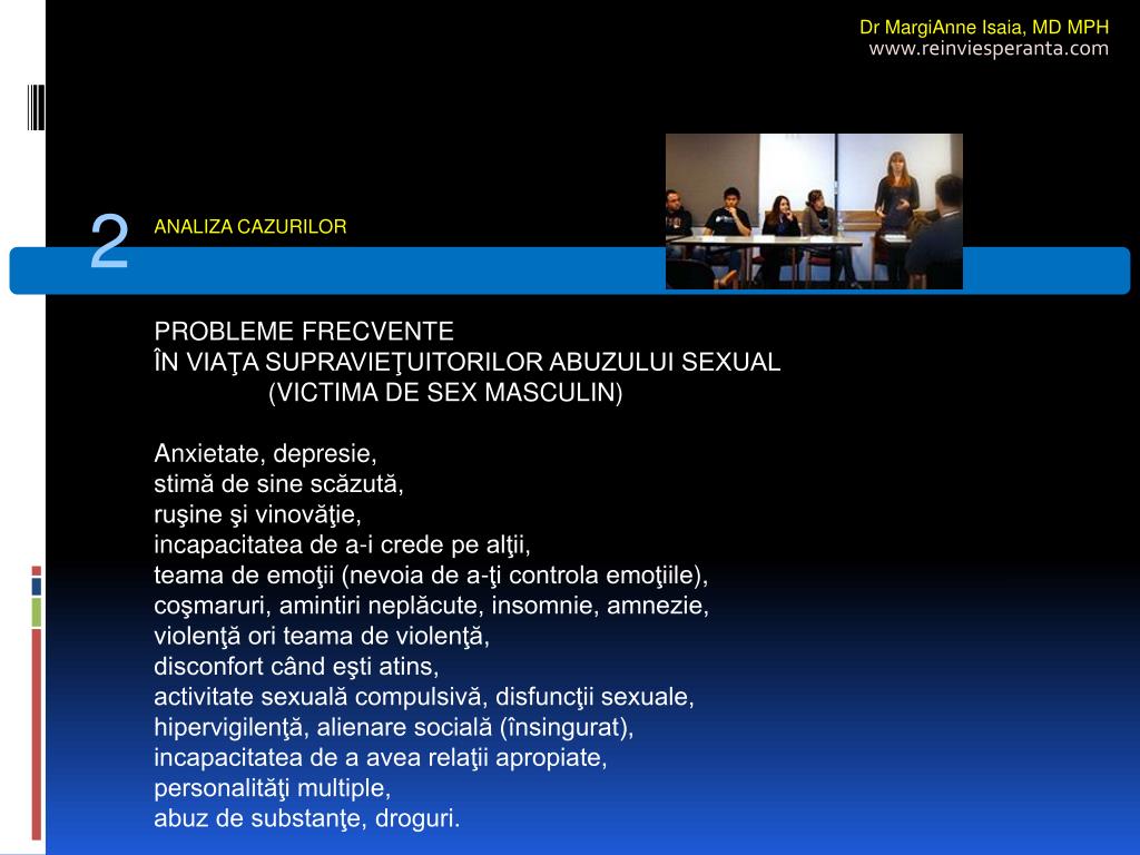 Dr MargiAnne Isaia,MD MPH www.reinviesperanta.com 2 ANALIZA CAZURILOR PROBLEME FRECVENTE ÎN VIAŢA SUPRAVIEŢUITORILOR ABUZULUI SEXUAL (VICTIMA DE SEX MASCULIN) Anxietate, depresie, stimă de sine scăzută, ruşine şi vinovăţie, incapacitatea de a-i crede pe alţii, teama de emoţii (nevoia de a-ţi controla emoţiile), coşmaruri, amintiri neplăcute, insomnie, amnezie, violenţă ori teama de violenţă, disconfort când eşti atins, activitate sexuală compulsivă, disfuncţii sexuale, hipervigilenţă, alienare socială (însingurat), incapacitatea de a avea relaţii apropiate, personalităţi multiple, abuz de substanţe, droguri.