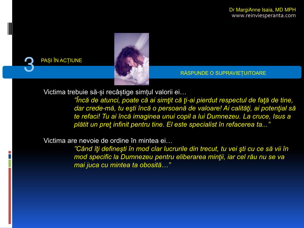 Dr MargiAnne Isaia,MD MPH www.reinviesperanta.com 3 PAȘI ÎN ACȚIUNE RĂSPUNDE O SUPRAVIEȚUITOARE • Victima trebuie să-și recâștige simțul valorii ei… • ”Încă de atunci, poate că ai simţit că ţi-ai pierdut respectul de faţă de tine, dar crede-mă, tu eşti încă o persoană de valoare! Ai calităţi, ai potenţial să te refaci! Tu ai încă imaginea unui copil a lui Dumnezeu. La cruce, Isus a plătit un preţ infinit pentru tine. El este specialist în refacerea ta...” • Victima are nevoie de ordine în mintea ei… • ”Când îţi defineşti în mod clar lucrurile din trecut, tu vei şti cu ce să vii în mod specific la Dumnezeu pentru eliberarea minţii, iar cel rău nu se va mai juca cu mintea ta obosită…”