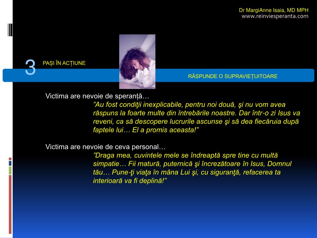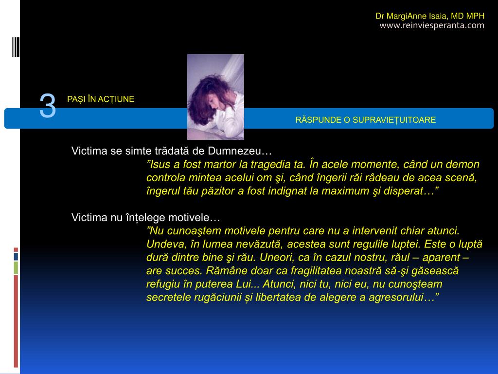 Dr MargiAnne Isaia,MD MPH www.reinviesperanta.com 3 PAȘI ÎN ACȚIUNE RĂSPUNDE O SUPRAVIEȚUITOARE • Victima se simte trădată de Dumnezeu… • ”Isus a fost martor la tragedia ta. În acele momente, când un demon controla mintea acelui om şi, când îngerii răi râdeau de acea scenă, îngerul tău păzitor a fost indignat la maximum şi disperat…” • Victima nu înțelege motivele… • ”Nu cunoaştem motivele pentru care nu a intervenit chiar atunci. Undeva, în lumea nevăzută, acestea sunt regulile luptei. Este o luptă dură dintre bine şi rău. Uneori, ca în cazul nostru, răul – aparent – are succes. Rămâne doar ca fragilitatea noastră să-şi găsească refugiu în puterea Lui... Atunci, nici tu, nici eu, nu cunoşteam secretele rugăciunii și libertatea de alegere a agresorului…”