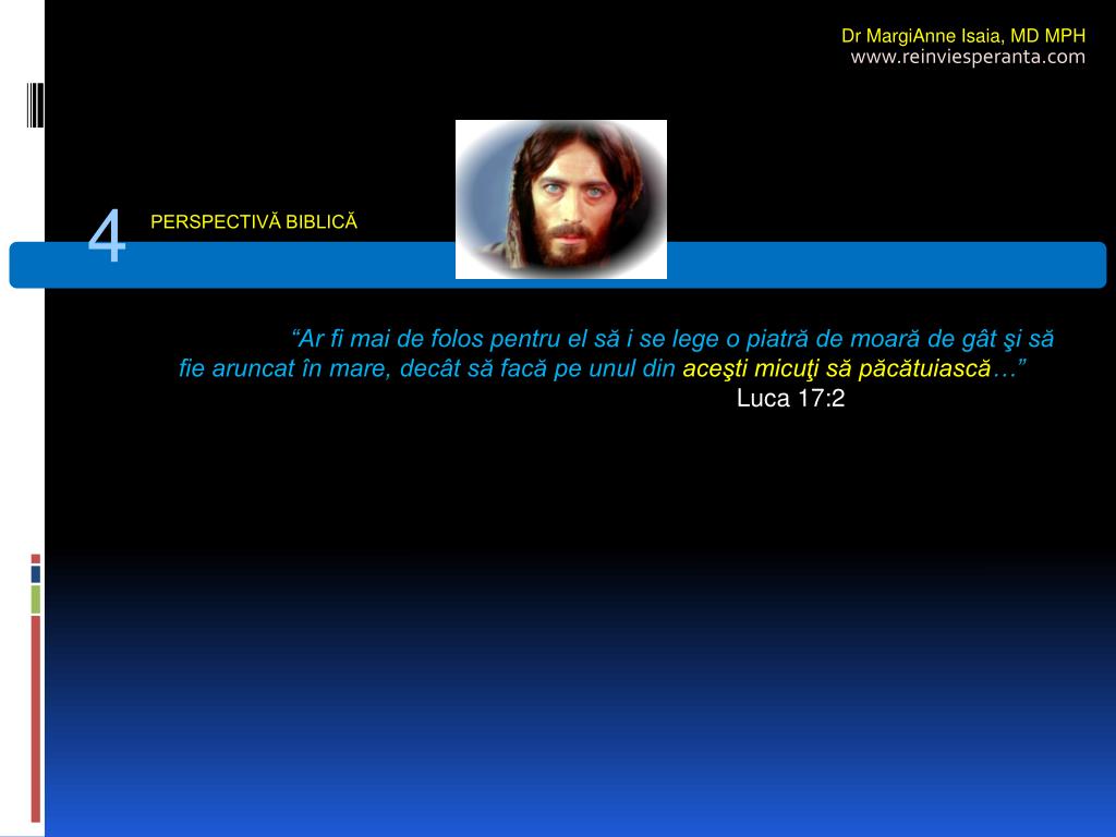 Dr MargiAnne Isaia,MD MPH www.reinviesperanta.com 4 PERSPECTIVĂ BIBLICĂ “Ar fi mai de folos pentru el să i se lege o piatră de moară de gât şi să fie aruncat în mare, decât să facă pe unul din aceşti micuţi să păcătuiască…” Luca 17:2