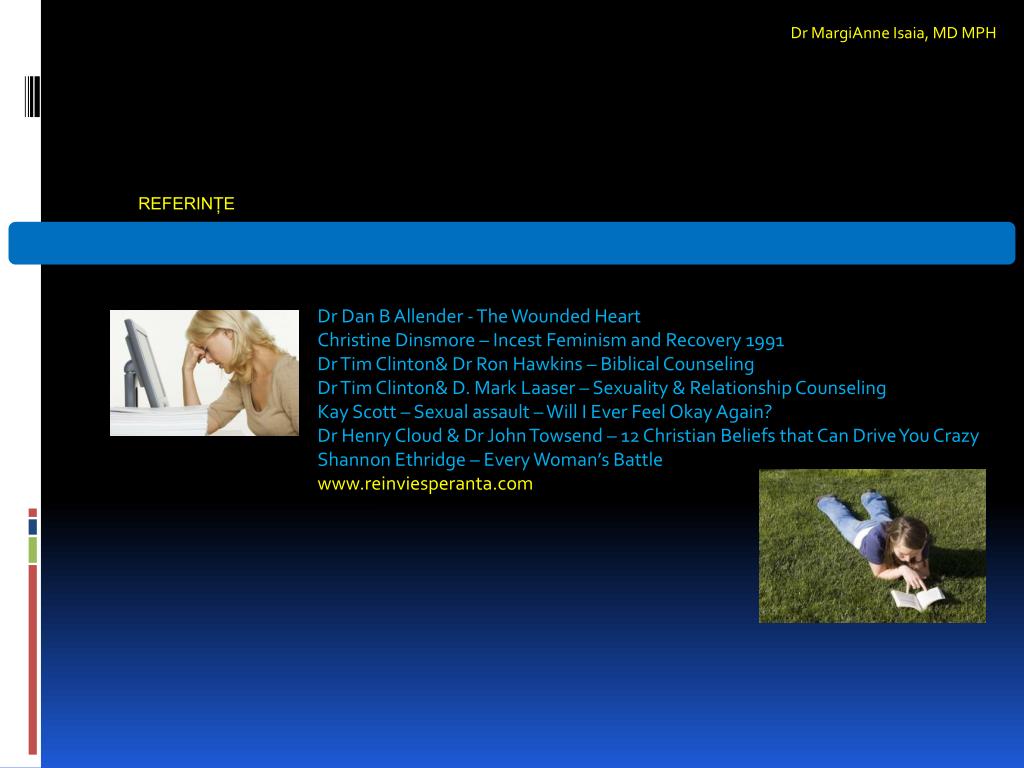Dr MargiAnne Isaia,MD MPH REFERINȚE Dr Dan B Allender - The Wounded Heart Christine Dinsmore – Incest Feminism and Recovery 1991 Dr Tim Clinton& Dr Ron Hawkins – Biblical Counseling Dr Tim Clinton& D. Mark Laaser – Sexuality & Relationship Counseling Kay Scott – Sexual assault – Will I Ever Feel Okay Again? Dr Henry Cloud & Dr John Towsend – 12 Christian Beliefs that Can Drive You Crazy Shannon Ethridge – Every Woman’s Battle www.reinviesperanta.com