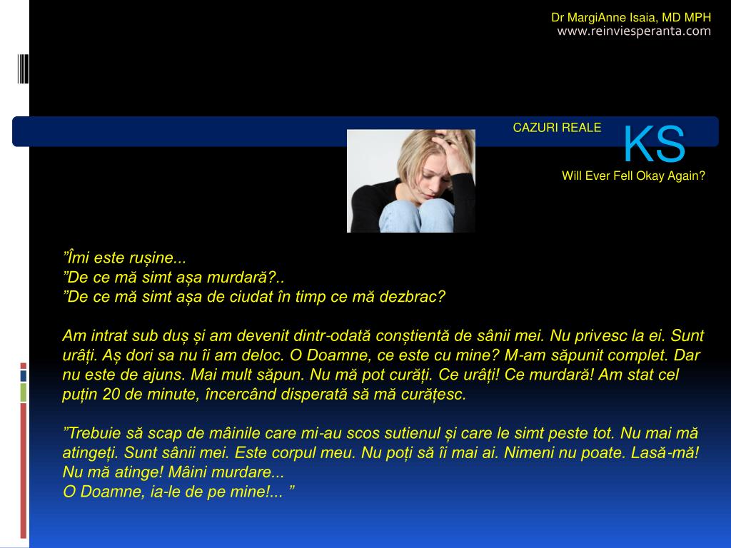 Dr MargiAnne Isaia,MD MPH www.reinviesperanta.com KS CAZURI REALE Will Ever Fell Okay Again? ”Îmi este rușine... ”De ce mă simt așa murdară?.. ”De ce mă simt așa de ciudat în timp ce mă dezbrac? Am intrat sub duș și am devenit dintr-odată conștientă de sânii mei. Nu privesc la ei. Sunt urâți. Aș dori sa nu îi am deloc. O Doamne, ce este cu mine? M-am săpunit complet. Dar nu este de ajuns. Mai mult săpun. Nu mă pot curăți. Ce urâți! Ce murdară! Am stat cel puțin 20 de minute, încercând disperată să mă curățesc. ”Trebuie să scap de mâinile care mi-au scos sutienul și care le simt peste tot. Nu mai mă atingeți. Sunt sânii mei. Este corpul meu. Nu poți să îi mai ai. Nimeni nu poate. Lasă-mă! Nu mă atinge! Mâini murdare... O Doamne, ia-le de pe mine!... ”