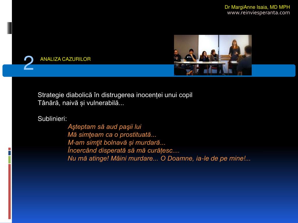 Dr MargiAnne Isaia,MD MPH www.reinviesperanta.com 2 ANALIZA CAZURILOR Strategie diabolică în distrugerea inocenței unui copil Tânără, naivă și vulnerabilă... Sublinieri: Aşteptam să aud paşii lui Mă simţeam ca o prostituată... M-am simţit bolnavă și murdară... Încercând disperată să mă curățesc.... Nu mă atinge! Mâini murdare... O Doamne, ia-le de pe mine!...