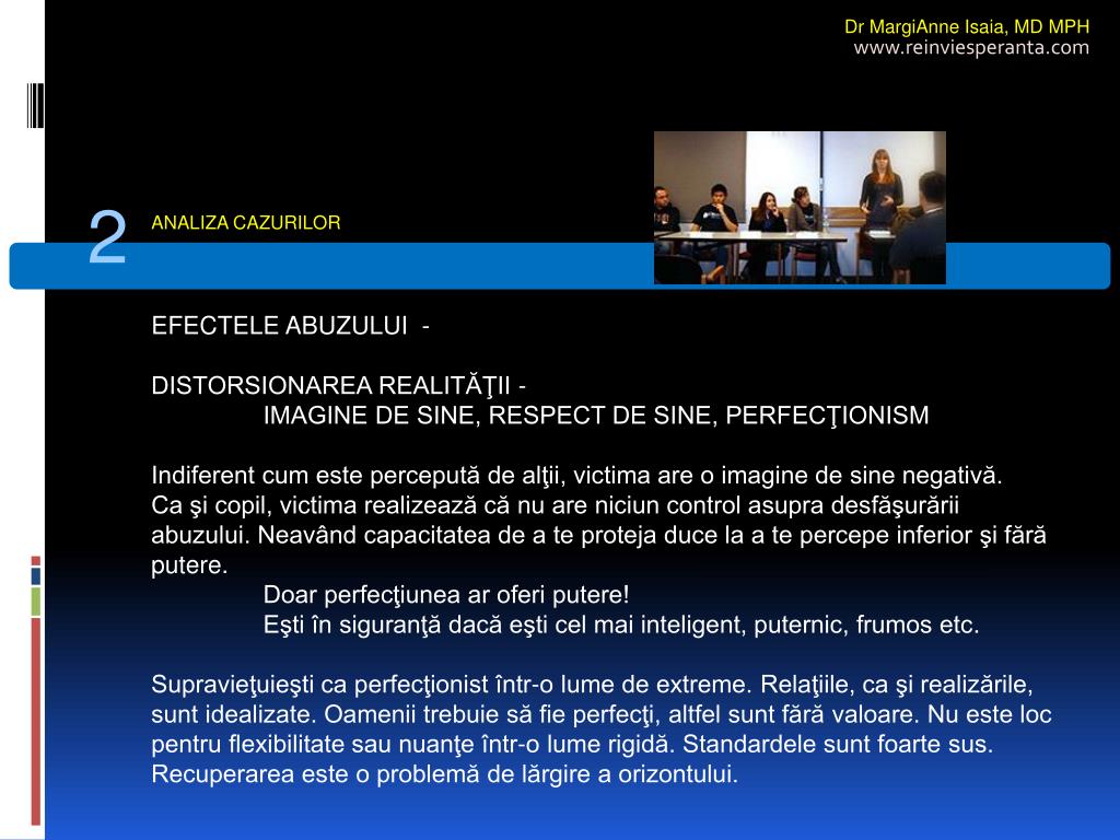 Dr MargiAnne Isaia,MD MPH www.reinviesperanta.com 2 ANALIZA CAZURILOR EFECTELE ABUZULUI - DISTORSIONAREA REALITĂŢII - IMAGINE DE SINE, RESPECT DE SINE, PERFECŢIONISM Indiferent cum este percepută de alţii, victima are o imagine de sine negativă. Ca şi copil, victima realizează că nu are niciun control asupra desfăşurării abuzului. Neavând capacitatea de a te proteja duce la a te percepe inferior şi fără putere. Doar perfecţiunea ar oferi putere! Eşti în siguranţă dacă eşti cel mai inteligent, puternic, frumos etc. Supravieţuieşti ca perfecţionist într-o lume de extreme. Relaţiile, ca şi realizările, sunt idealizate. Oamenii trebuie să fie perfecţi, altfel sunt fără valoare. Nu este loc pentru flexibilitate sau nuanţe într-o lume rigidă. Standardele sunt foarte sus. Recuperarea este o problemă de lărgire a orizontului.