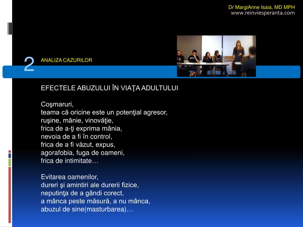 Dr MargiAnne Isaia,MD MPH www.reinviesperanta.com 2 ANALIZA CAZURILOR EFECTELE ABUZULUI ÎN VIAŢA ADULTULUI Coşmaruri, teama că oricine este un potenţial agresor, ruşine, mânie, vinovăţie, frica de a-ţi exprima mânia, nevoia de a fi în control, frica de a fi văzut, expus, agorafobia, fuga de oameni, frica de intimitate… Evitarea oamenilor, dureri şi amintiri ale durerii fizice, neputinţa de a gândi corect, a mânca peste măsură, a nu mânca, abuzul de sine(masturbarea)…