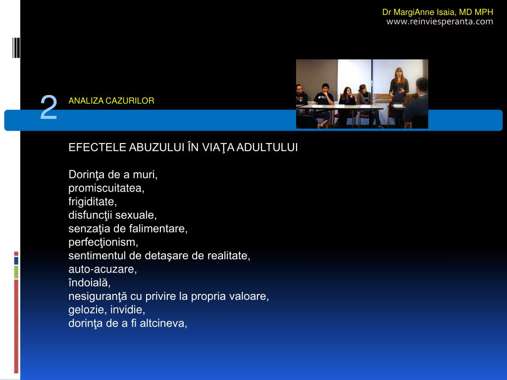 Dr MargiAnne Isaia,MD MPH www.reinviesperanta.com 2 ANALIZA CAZURILOR EFECTELE ABUZULUI ÎN VIAŢA ADULTULUI Dorinţa de a muri, promiscuitatea, frigiditate, disfuncţii sexuale, senzaţia de falimentare, perfecţionism, sentimentul de detaşare de realitate, auto-acuzare, îndoială, nesiguranţă cu privire la propria valoare, gelozie, invidie, dorinţa de a fi altcineva,