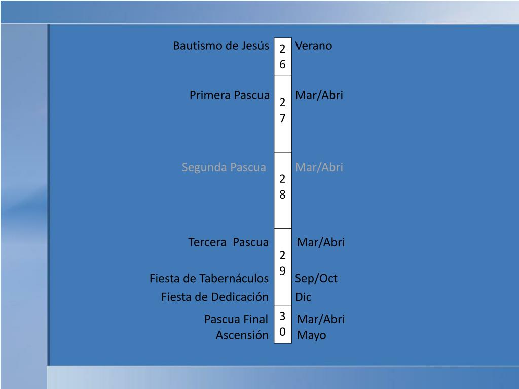 El ministerio de Cristo. Una vista panorámica. Bautismo de Jesús. Verano. 26. 27. Primera Pascua. Mar/ Abri. 28. Segunda Pascua. Mar/ Abri. 29. Tercera Pascua. Mar/ Abri. Sep/Oct. Fiesta de Tabernáculos. Fiesta de Dedicación. Dic. 30. Pascua Final. Mar/ Abri. Mayo.