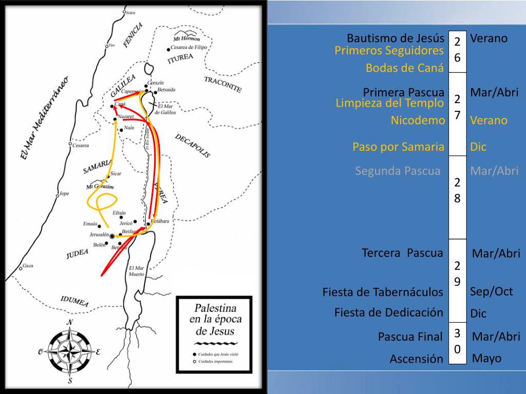 Bautismo de Jesús Verano 26 27 Primera Pascua Mar/Abri 28 Segunda Pascua Mar/Abri 29 Tercera Pascua Mar/Abri Sep/Oct Fiesta de Tabernáculos Fiesta de Dedicación Dic 30 Mar/Abri Pascua Final Mayo Ascensión PrimerosSeguidores Bodas de Caná Limpieza del Templo Verano Nicodemo Paso por Samaria Dic