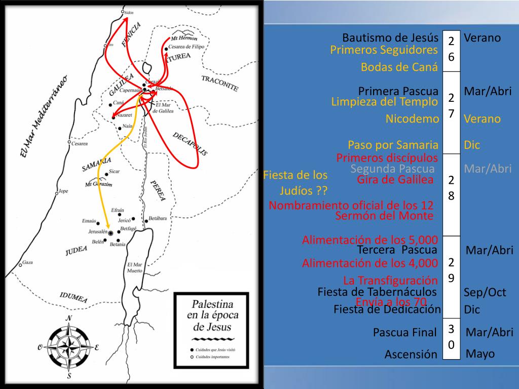 Bautismo de Jesús Verano 26 27 Primera Pascua Mar/Abri 28 Segunda Pascua Mar/Abri 29 Tercera Pascua Mar/Abri Sep/Oct Dic 30 Mar/Abri Pascua Final Mayo Ascensión PrimerosSeguidores Bodas de Caná Limpieza del Templo Verano Nicodemo Paso por Samaria Dic Primerosdiscípulos Fiesta de los Judíos ?? Gira de Galilea Nombramientooficial de los 12 Sermón del Monte Alimentación de los 5,000 Alimentación de los 4,000 La Transfiguración Fiesta de Tabernáculos Envía a los 70 Fiesta de Dedicación