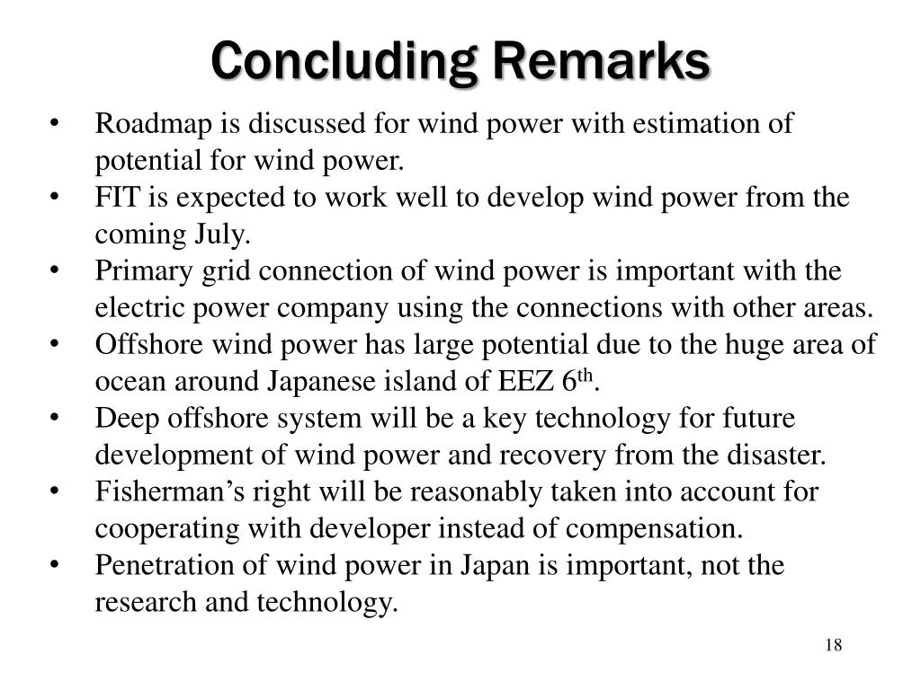 Concluding Remarks • Roadmap is discussed for wind power with estimation of potential for wind power. • FIT is expected to work well to develop wind power from the coming July. • Primary grid connection of wind power is important with the electric power company using the connections with other areas. • Offshore wind power has large potential due to the huge area of ocean around Japanese island of EEZ 6th. • Deep offshore system will be a key technology for future development of wind power and recovery from the disaster. • Fisherman’s right will be reasonably taken into account for cooperating with developer instead of compensation. • Penetration of wind power in Japan is important, not the research and technology.