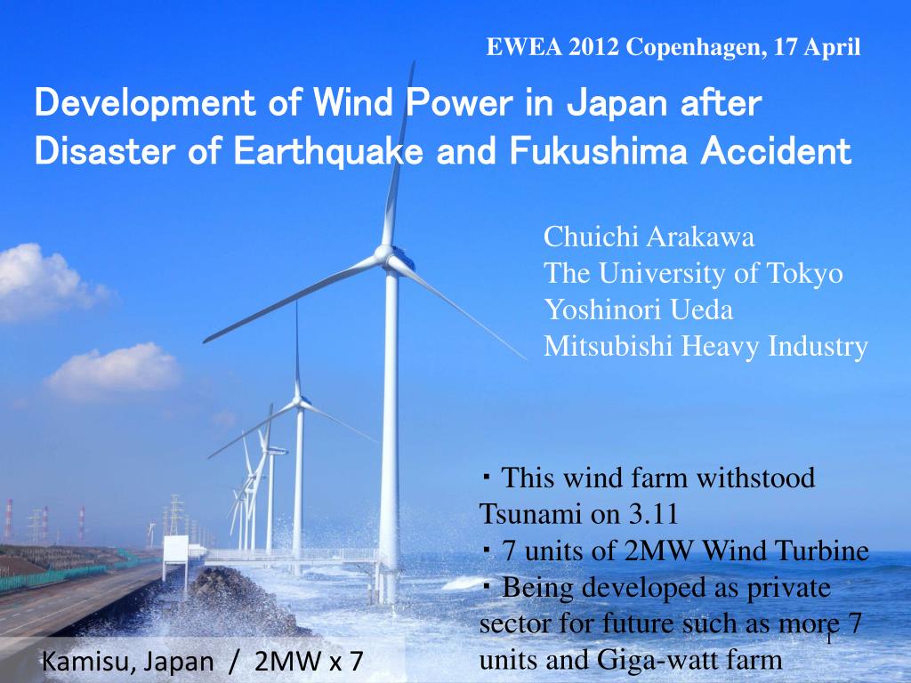 EWEA 2012 Copenhagen, 17 April. Development of Wind Power in Japan after Disaster of Earthquake and Fukushima Accident. Chuichi Arakawa The University of Tokyo Yoshinori Ueda Mitsubishi Heavy Industry. ・ This wind farm withstood Tsunami on 3.11 ・ 7 units of 2MW Wind Turbine