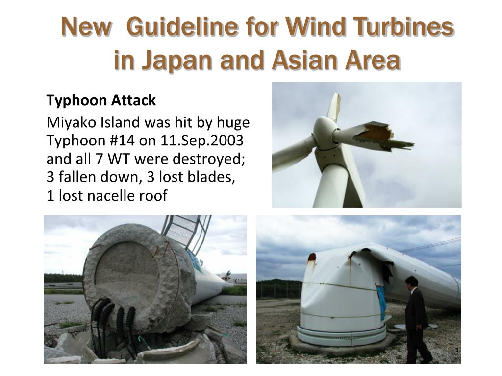 Typhoon Attack Miyako Island was hit by huge Typhoon #14 on 11.Sep.2003 and all 7 WT were destroyed; 3 fallen down, 3 lost blades, 1 lost nacelle roof New Guideline for Wind Turbines in Japan and Asian Area