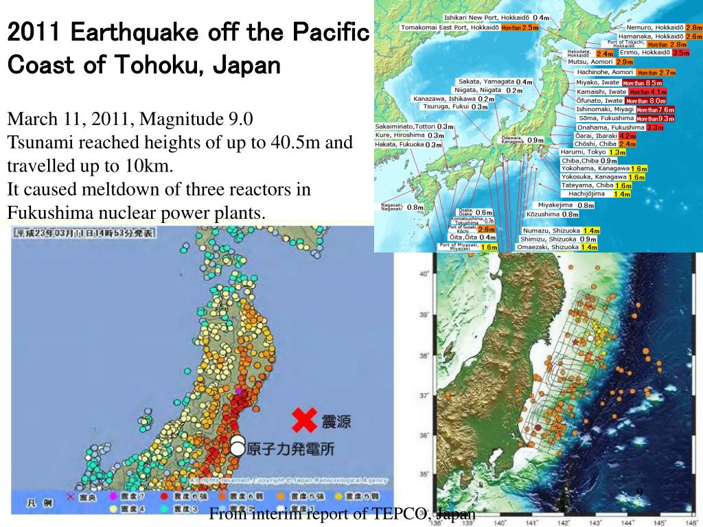 2011 Earthquake off the Pacific Coast of Tohoku, Japan March 11, 2011, Magnitude 9.0 Tsunami reached heights of up to 40.5m and travelled up to 10km. It caused meltdown of three reactors in Fukushima nuclear power plants. From interim report of TEPCO, Japan