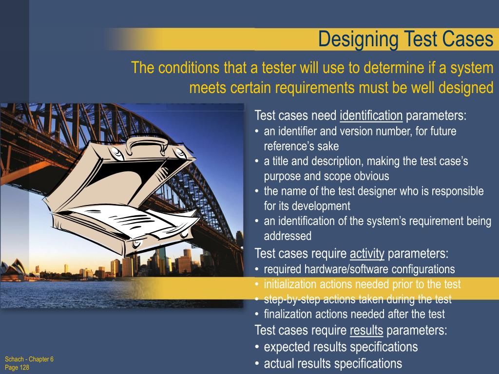 Designing Test Cases The conditions that a tester will use to determine if a system meets certain requirements must be well designed Test cases need identification parameters: • an identifier and version number, for future reference’s sake • a title and description, making the test case’s purpose and scope obvious • the name of the test designer who is responsible for its development • an identification of the system’s requirement being addressed Test cases require activity parameters: • required hardware/software configurations • initialization actions needed prior to the test • step-by-step actions taken during the test • finalization actions needed after the test Test cases require results parameters: • expected results specifications • actual results specifications Schach - Chapter 6 Page 128