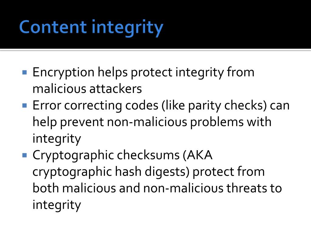 Content integrity • Encryption helps protect integrity from malicious attackers • Error correcting codes (like parity checks) can help prevent non-malicious problems with integrity • Cryptographic checksums (AKA cryptographic hash digests) protect from both malicious and non-malicious threats to integrity