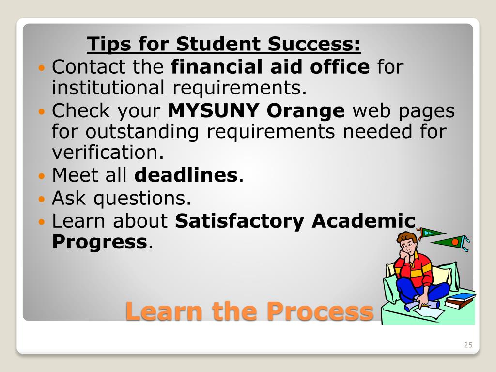 Tips for Student Success: • Contact the financial aid office for institutional requirements. • Check your MYSUNY Orange web pages for outstanding requirements needed for verification. • Meet all deadlines. • Ask questions. • Learn about Satisfactory Academic Progress. Learn the Process