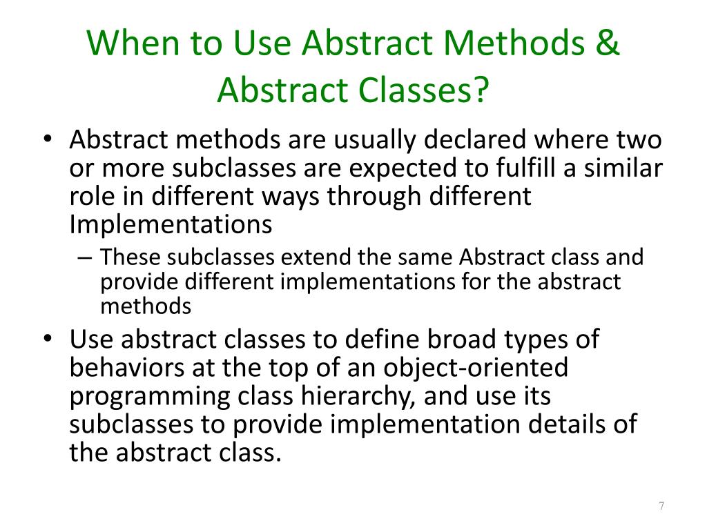 When to Use Abstract Methods & Abstract Classes? • Abstract methods are usually declared where two or more subclasses are expected to fulfill a similar role in different ways through different Implementations • These subclasses extend the same Abstract class and provide different implementations for the abstract methods • Use abstract classes to define broad types of behaviors at the top of an object-oriented programming class hierarchy, and use its subclasses to provide implementation details of the abstract class.