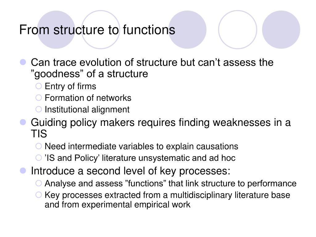From structure to functions • Can trace evolution of structure but can’t assess the ”goodness” of a structure • Entry of firms • Formation of networks • Institutional alignment • Guiding policy makers requires finding weaknesses in a TIS • Need intermediate variables to explain causations • ’IS and Policy’ literature unsystematic and ad hoc • Introduce a second level of key processes: • Analyse and assess ”functions” that link structure to performance • Key processes extracted from a multidisciplinary literature base and from experimental empirical work