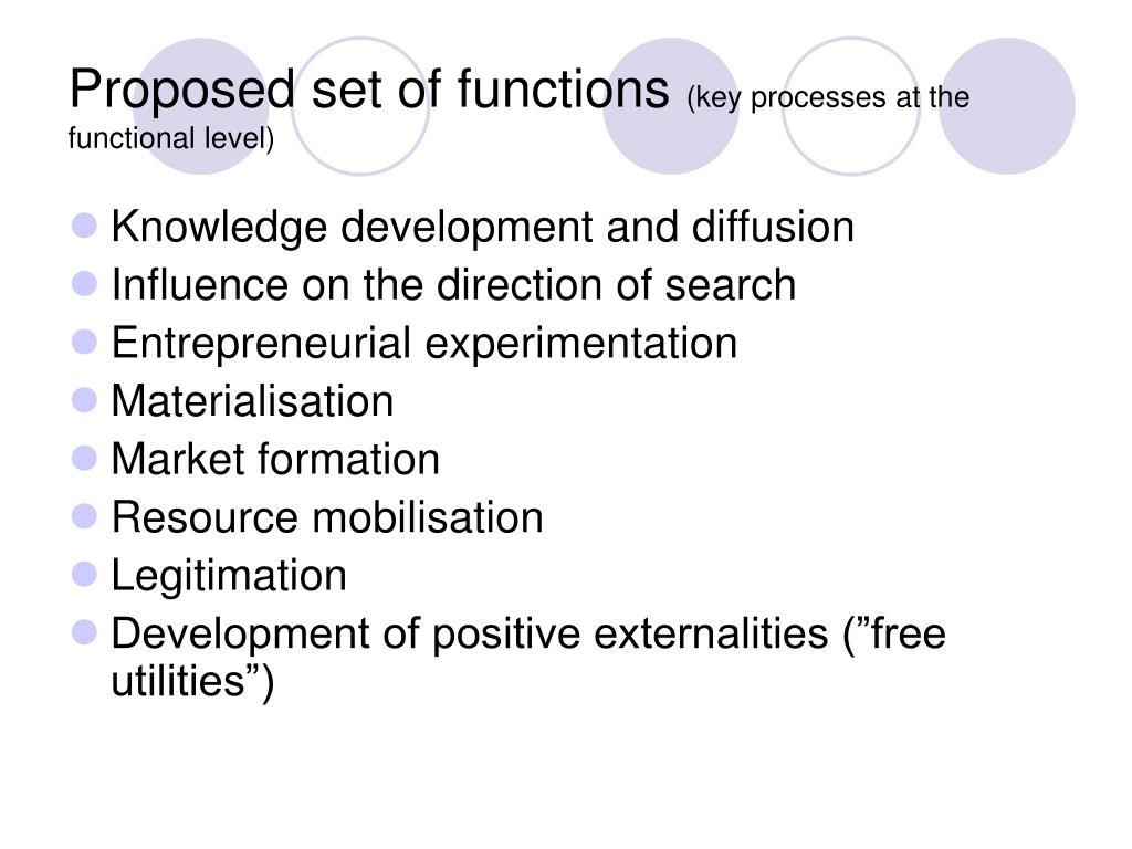 Proposed set of functions (key processes at the functional level) • Knowledge development and diffusion • Influence on the direction of search • Entrepreneurial experimentation • Materialisation • Market formation • Resource mobilisation • Legitimation • Development of positive externalities (”free utilities”)