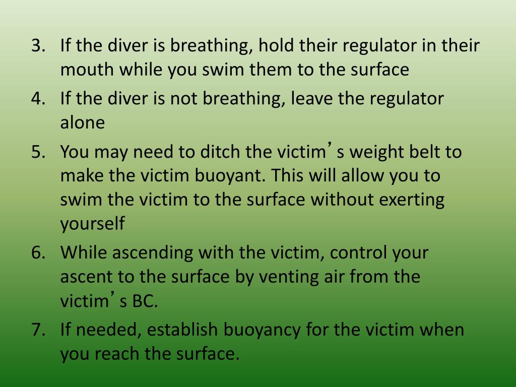 If the diver is breathing, hold their regulator in their mouth while you swim them to the surface • If the diver is not breathing, leave the regulator alone • You may need to ditch the victim’s weight belt to make the victim buoyant. This will allow you to swim the victim to the surface without exerting yourself • While ascending with the victim, control your ascent to the surface by venting air from the victim’s BC. • If needed, establish buoyancy for the victim when you reach the surface.