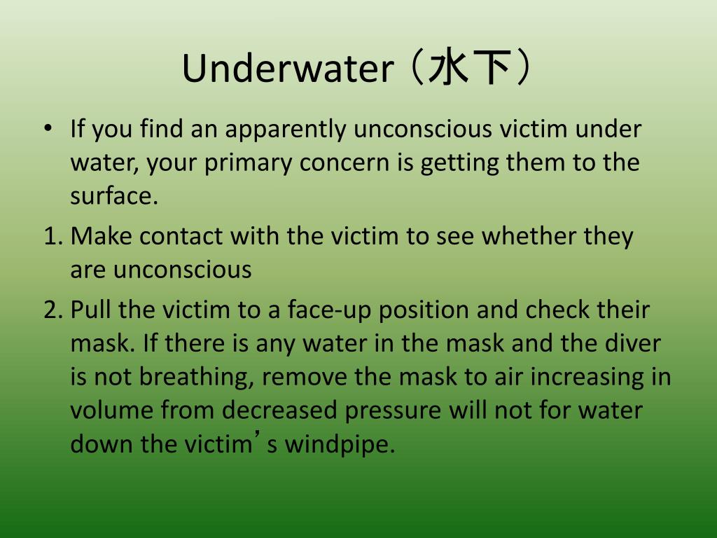 Underwater (水下) • If you find an apparently unconscious victim under water, your primary concern is getting them to the surface. • Make contact with the victim to see whether they are unconscious • Pull the victim to a face-up position and check their mask. If there is any water in the mask and the diver is not breathing, remove the mask to air increasing in volume from decreased pressure will not for water down the victim’s windpipe.
