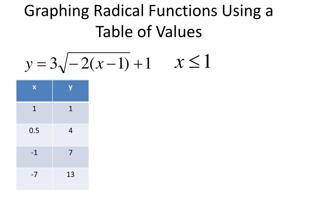 Graphing Radical Functions Using a Table of Values • A good place to start is to determine the domain • The radicand must be greater than or equal to zero Remember to reverse the inequality when multiplying or dividing by a negative number