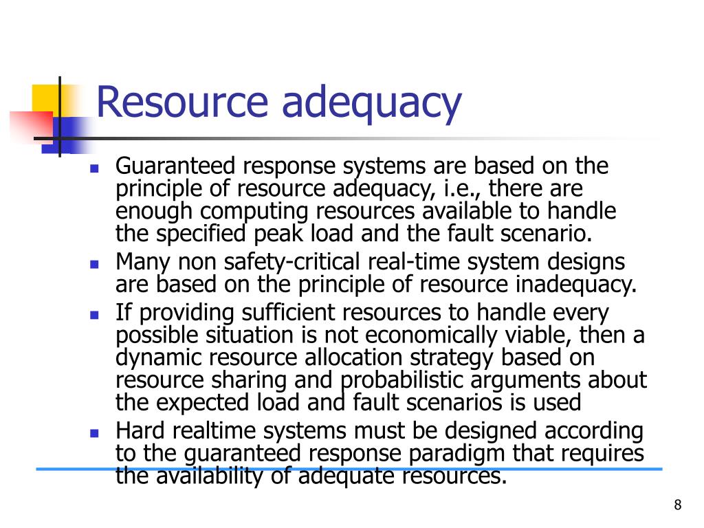 Resource adequacy • Guaranteed response systems are based on the principle of resource adequacy, i.e., there are enough computing resources available to handle the specified peak load and the fault scenario. • Many non safety-critical real-time system designs are based on the principle of resource inadequacy. • If providing sufficient resources to handle every possible situation is not economically viable, then a dynamic resource allocation strategy based on resource sharing and probabilistic arguments about the expected load and fault scenarios is used • Hard realtime systems must be designed according to the guaranteed response paradigm that requires the availability of adequate resources.