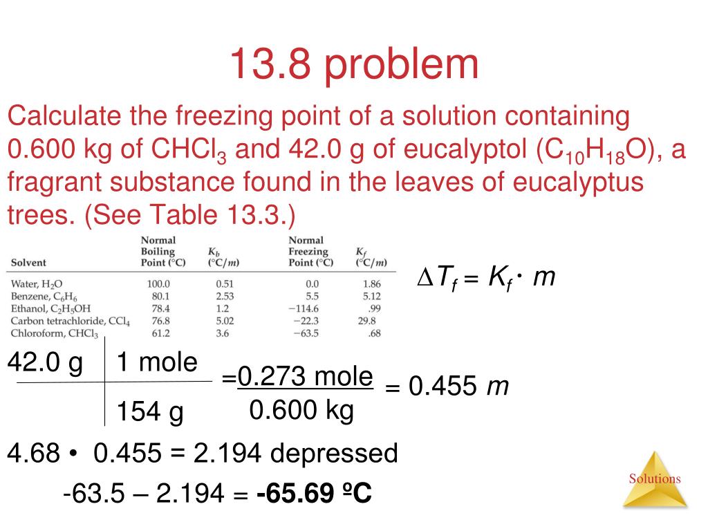 13.8 problem Calculate the freezing point of a solution containing 0.600 kg of CHCl3 and 42.0 g of eucalyptol (C10H18O), a fragrant substance found in the leaves of eucalyptus trees. (See Table 13.3.) Tf = Kf m 42.0 g 1 mole =0.273 mole = 0.455 m 0.600 kg 154 g 4.68 • 0.455 = 2.194 depressed -63.5 – 2.194 = -65.69 ºC