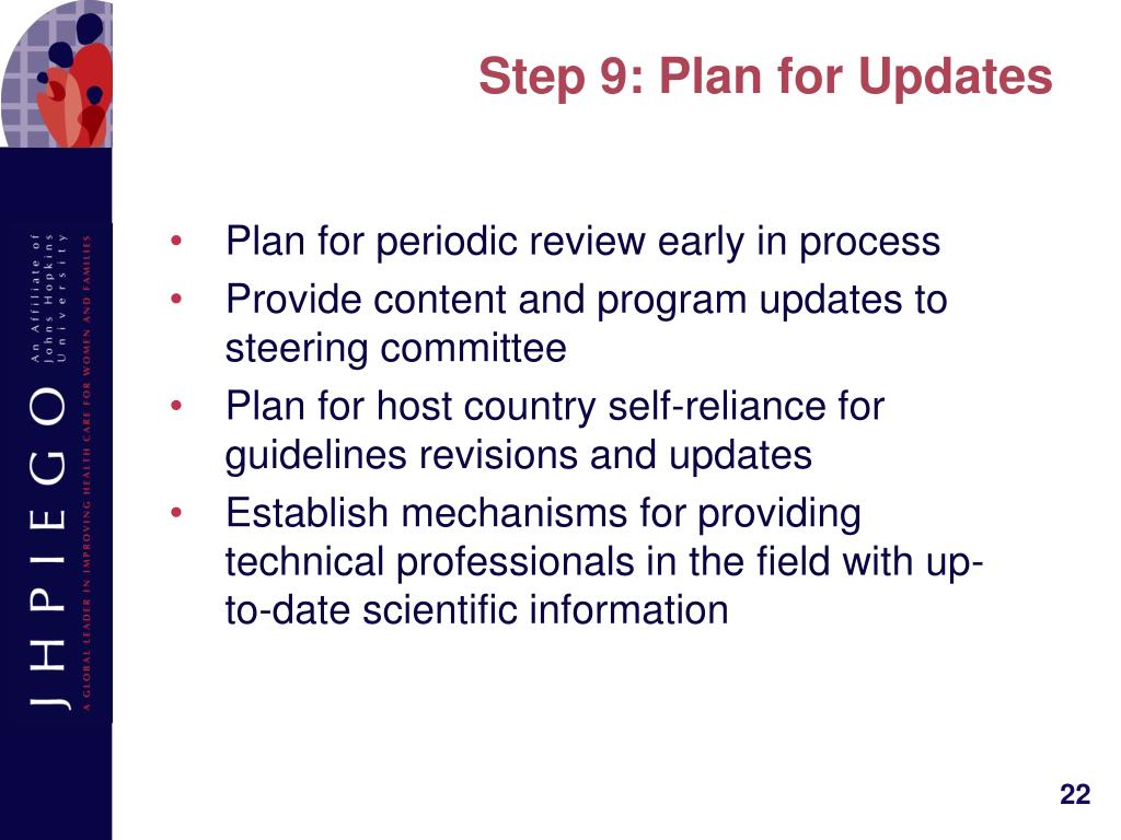 Step 9: Plan for Updates • Plan for periodic review early in process • Provide content and program updates to steering committee • Plan for host country self-reliance for guidelines revisions and updates • Establish mechanisms for providing technical professionals in the field with up-to-date scientific information