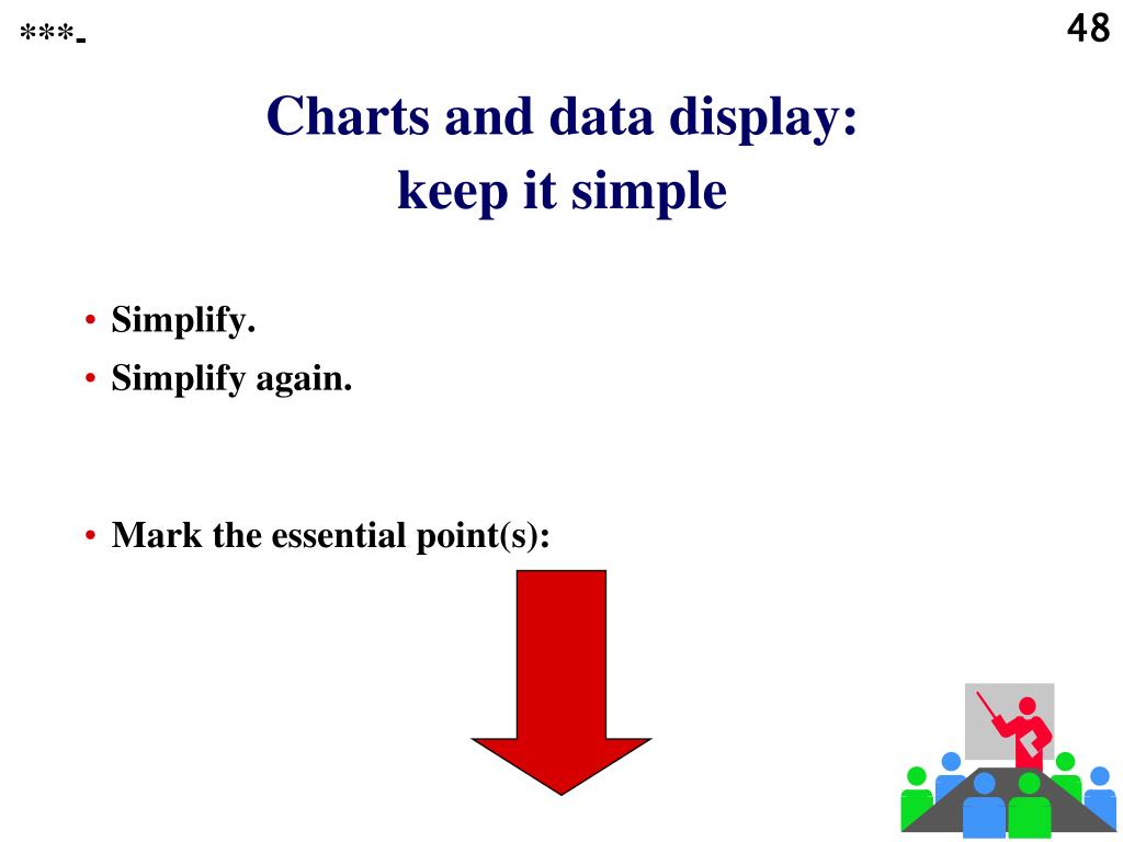***- Charts and data display:keep it simple • Simplify. • Simplify again. • Mark the essential point(s):