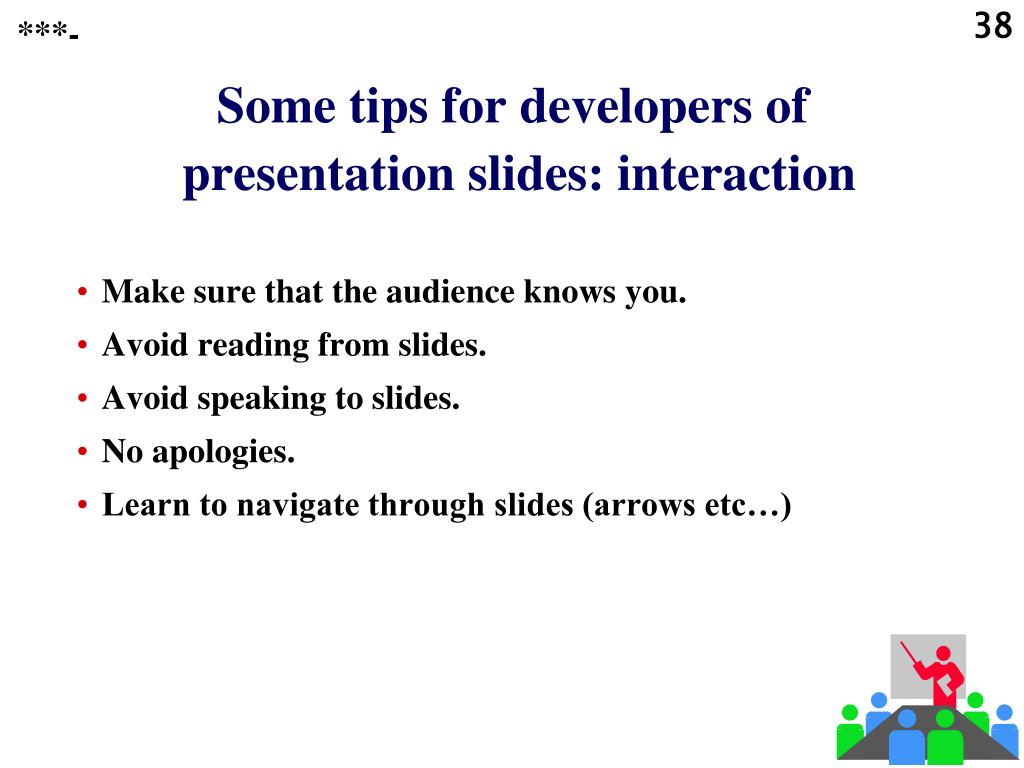 ***- Some tips for developers of presentation slides: interaction • Make sure that the audience knows you. • Avoid reading from slides. • Avoid speaking to slides. • No apologies. • Learn to navigate through slides (arrows etc…)
