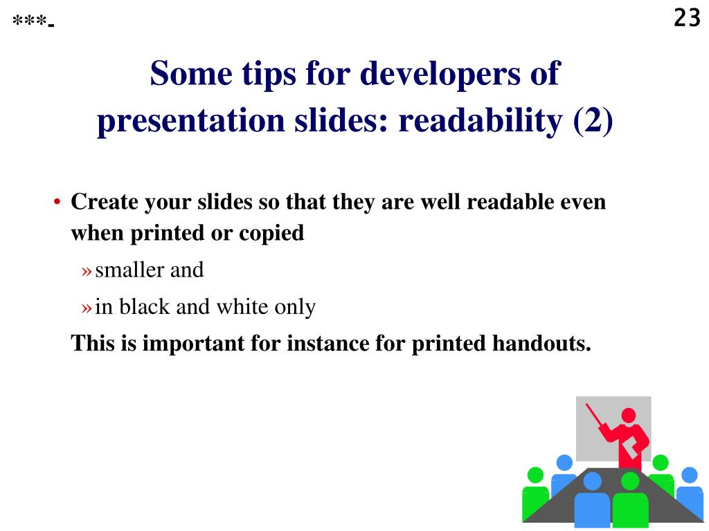 ***- Some tips for developers of presentation slides: readability (2) • Create your slides so that they are well readable even when printed or copied • smaller and • in black and white only This is important for instance for printed handouts.