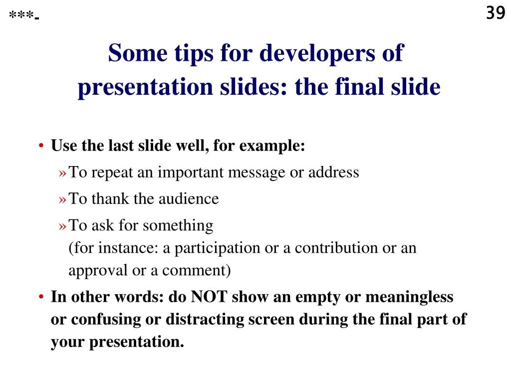 ***- Some tips for developers of presentation slides: the final slide • Use the last slide well, for example: • To repeat an important message or address • To thank the audience • To ask for something (for instance: a participation or a contribution or an approval or a comment) • In other words: do NOT show an empty or meaningless or confusing or distracting screen during the final part of your presentation.