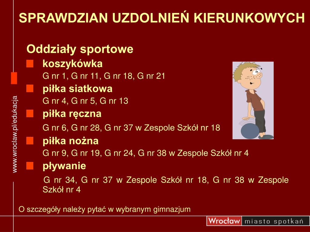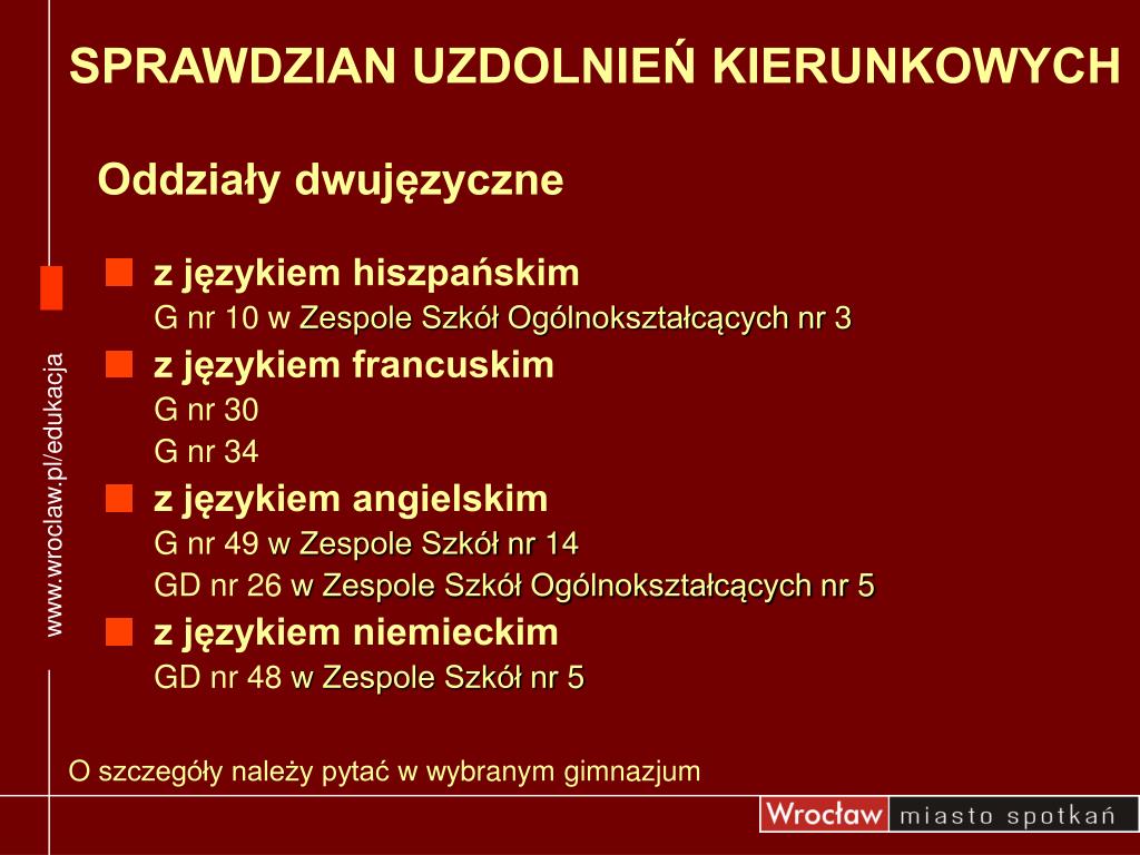 www.wroclaw.pl/edukacja SPRAWDZIAN UZDOLNIEŃ KIERUNKOWYCH O szczegóły należy pytać w wybranym gimnazjum Warunkiem koniecznym ubiegania się o przyjęcie do klas sportowych lub oddziałów dwujęzycznych jest uzyskanie przez kandydata pozytywnego wyniku z dodatkowego sprawdzianu predyspozycji lub uzdolnień kierunkowych organizowanego przez szkoły