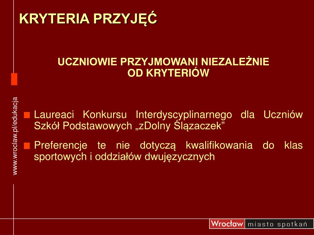 www.wroclaw.pl/edukacja KRYTERIA PRZYJĘĆ UCZNIOWIE PRZYJMOWANI NIEZALEŻNIE OD KRYTERIÓW • Laureaci Konkursu Interdyscyplinarnego dla Uczniów Szkół Podstawowych „zDolny Ślązaczek” • Preferencje te nie dotyczą kwalifikowania do klas sportowych i oddziałów dwujęzycznych