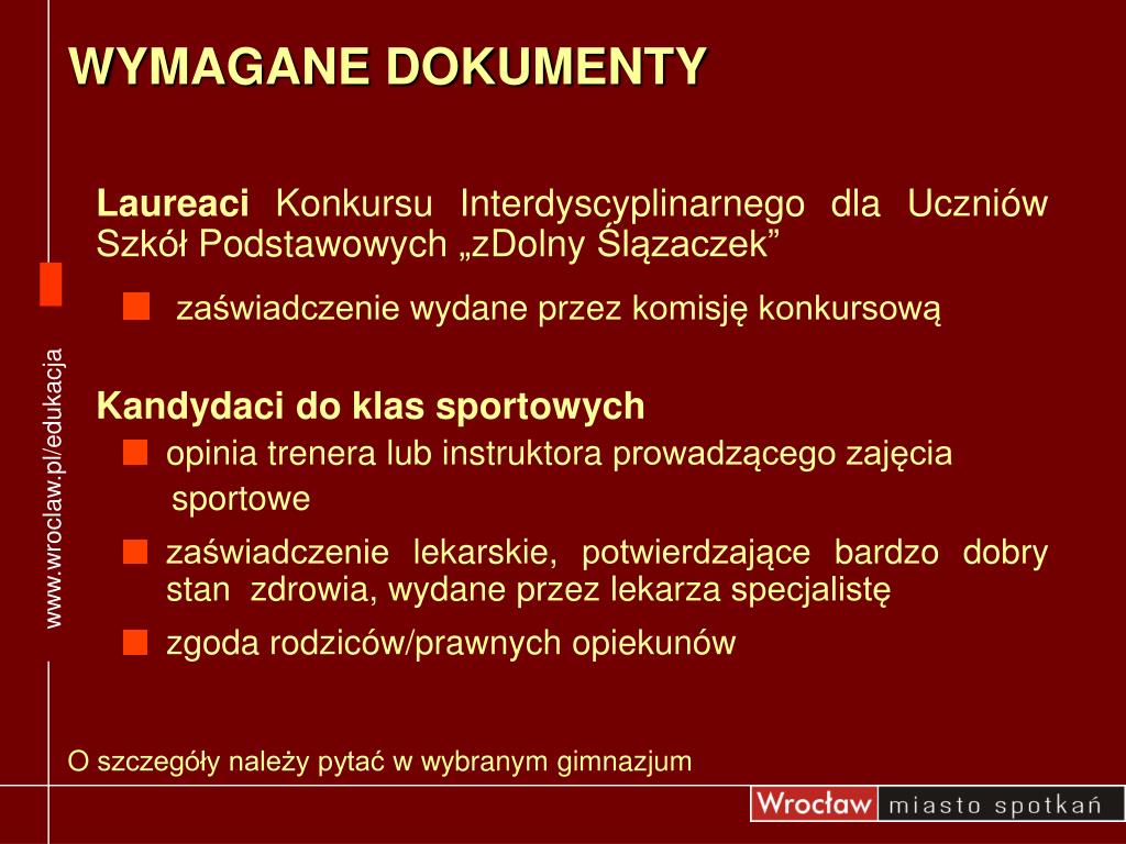 www.wroclaw.pl/edukacja WYMAGANE DOKUMENTY • LaureaciKonkursu Interdyscyplinarnego dla Uczniów Szkół Podstawowych „zDolny Ślązaczek” • zaświadczenie wydane przez komisję konkursową • Kandydaci do klas sportowych • opinia trenera lub instruktora prowadzącego zajęcia • sportowe • zaświadczenie lekarskie, potwierdzające bardzo dobry stan zdrowia, wydane przez lekarza specjalistę • zgoda rodziców/prawnych opiekunów O szczegóły należy pytać w wybranym gimnazjum