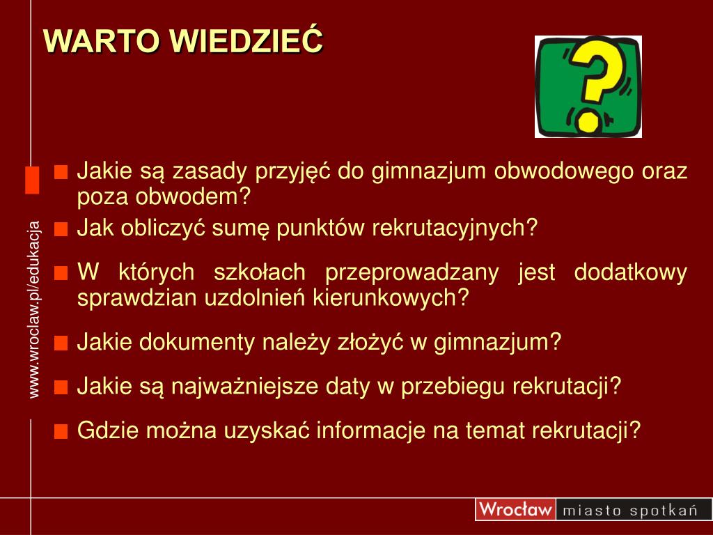 www.wroclaw.pl/edukacja WARTO WIEDZIEĆ • Jakie są zasady przyjęć do gimnazjum obwodowego oraz poza obwodem? • Jak obliczyć sumę punktów rekrutacyjnych? • W których szkołach przeprowadzany jest dodatkowy sprawdzian uzdolnień kierunkowych? • Jakie dokumenty należy złożyć w gimnazjum? • Jakie są najważniejsze daty w przebiegu rekrutacji? • Gdzie można uzyskać informacje na temat rekrutacji?