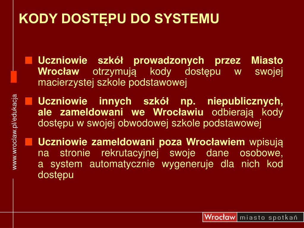 www.wroclaw.pl/edukacja KODY DOSTĘPU DO SYSTEMU • Uczniowie szkół prowadzonych przez Miasto Wrocław otrzymują kody dostępu w swojej macierzystej szkole podstawowej • Uczniowie innych szkół np. niepublicznych, ale zameldowani we Wrocławiu odbierają kody dostępu w swojej obwodowej szkole podstawowej • Uczniowie zameldowani poza Wrocławiem wpisują na stronie rekrutacyjnej swoje dane osobowe, a system automatycznie wygeneruje dla nich kod dostępu