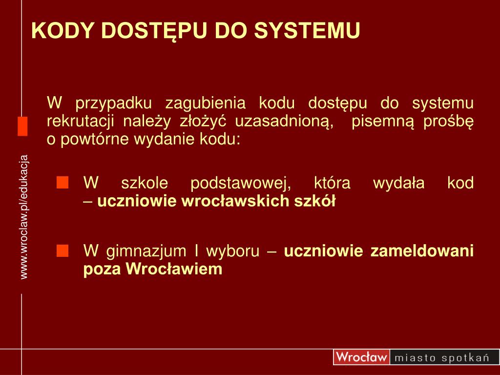 www.wroclaw.pl/edukacja KODY DOSTĘPU DO SYSTEMU • W przypadku zagubienia kodu dostępu do systemu rekrutacji należy złożyć uzasadnioną, pisemną prośbę o powtórne wydanie kodu: • W szkole podstawowej, która wydała kod – uczniowie wrocławskich szkół • W gimnazjum I wyboru – uczniowie zameldowani poza Wrocławiem