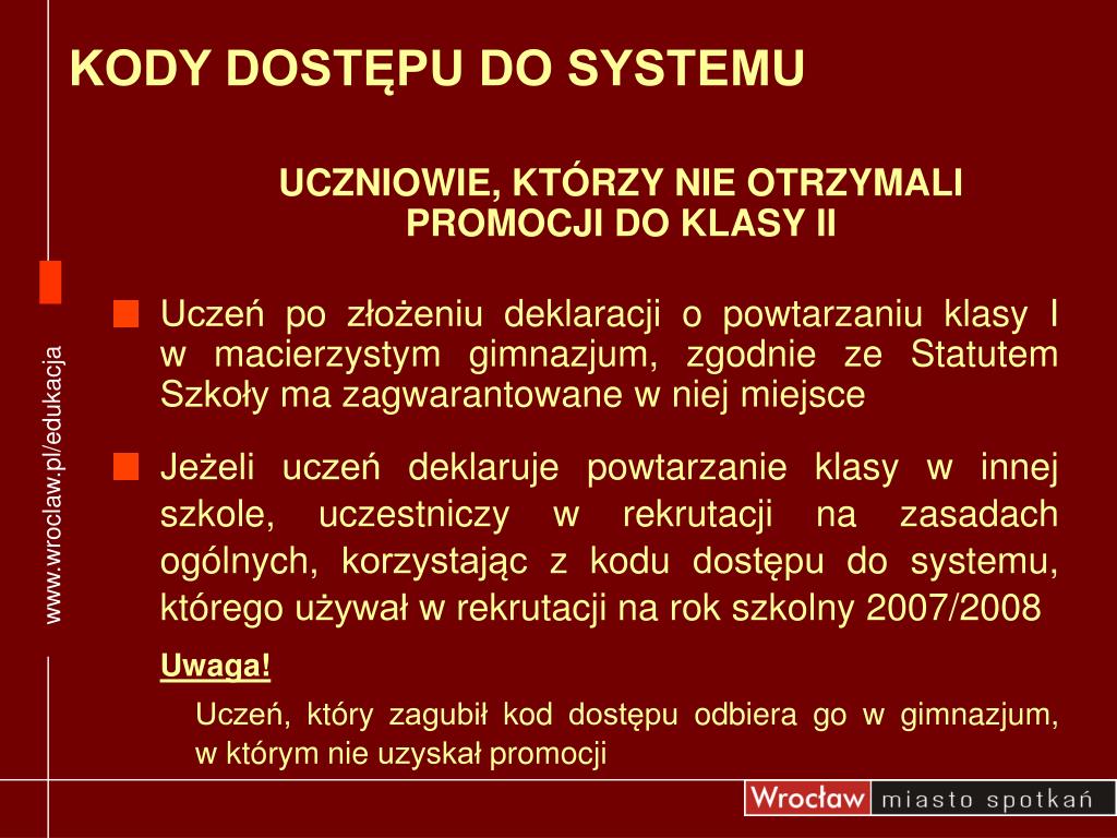 www.wroclaw.pl/edukacja KODY DOSTĘPU DO SYSTEMU • UCZNIOWIE, KTÓRZY NIE OTRZYMALI PROMOCJI DO KLASY II • Uczeń po złożeniu deklaracji o powtarzaniu klasy I w macierzystym gimnazjum, zgodnie ze Statutem Szkoły ma zagwarantowane w niej miejsce • Jeżeli uczeń deklaruje powtarzanie klasy w innej szkole, uczestniczy w rekrutacji na zasadach ogólnych, korzystając z kodu dostępu do systemu, którego używał w rekrutacji na rok szkolny 2007/2008 • Uwaga! • Uczeń, który zagubił kod dostępu odbiera go w gimnazjum, w którym nie uzyskał promocji