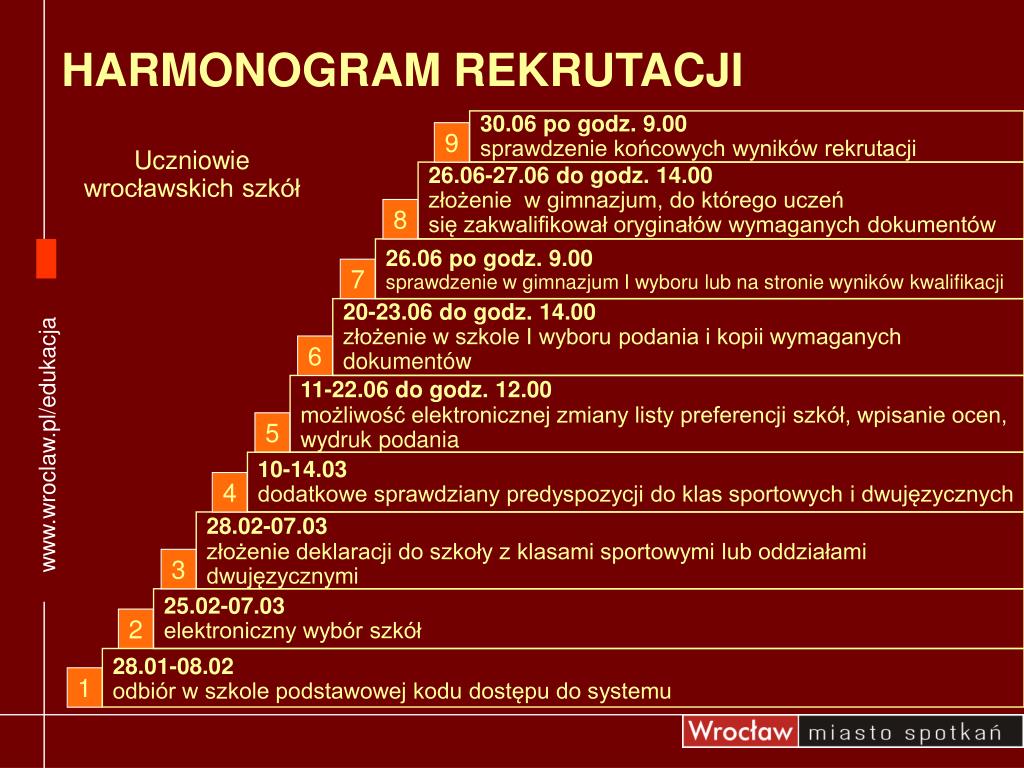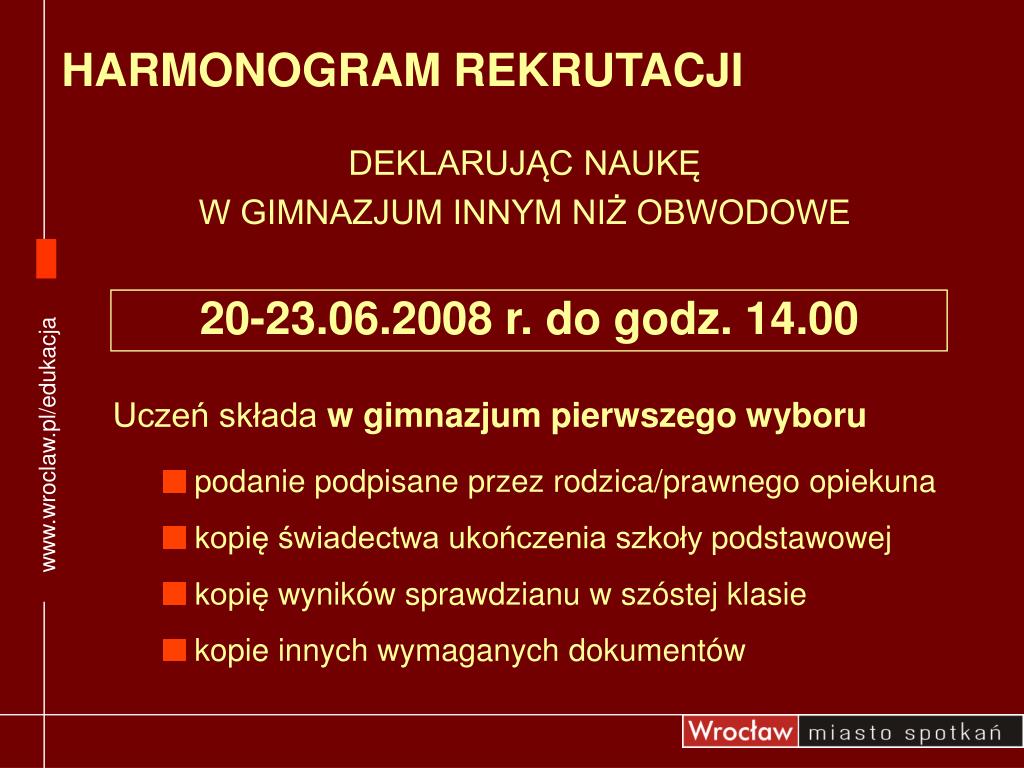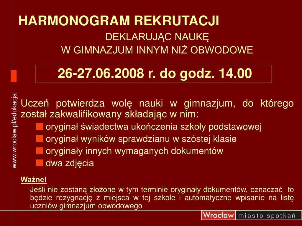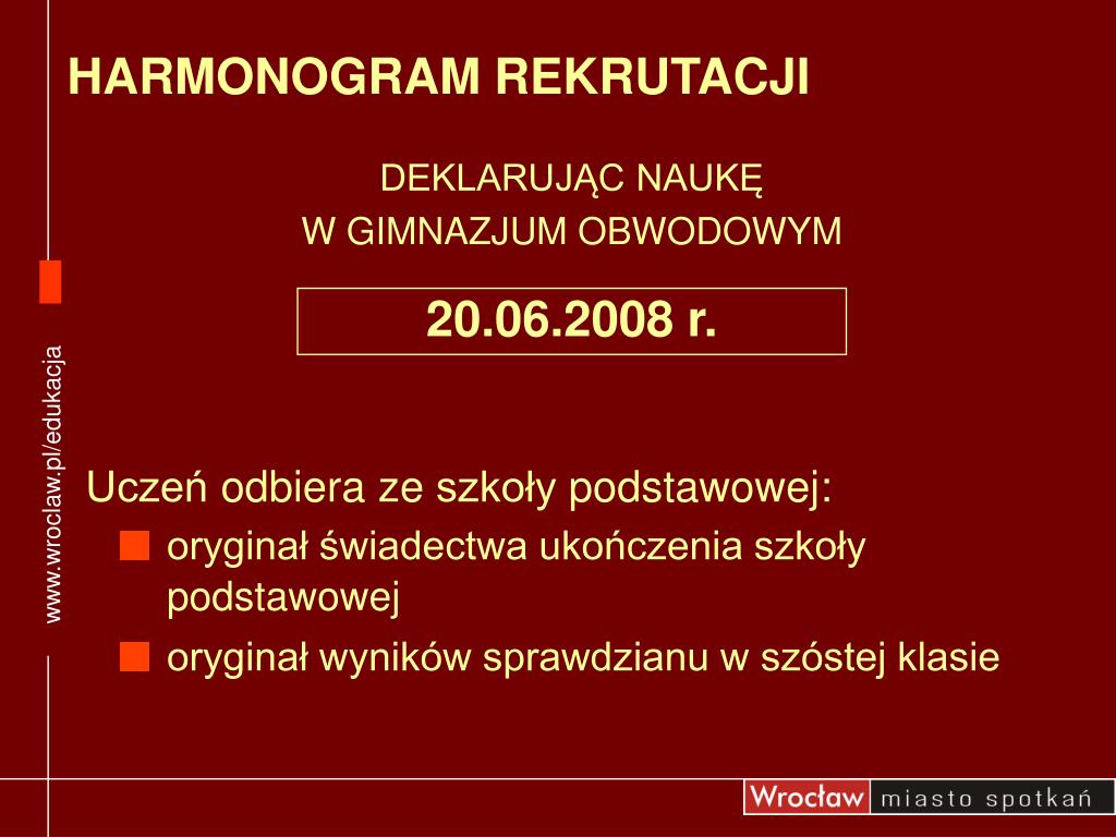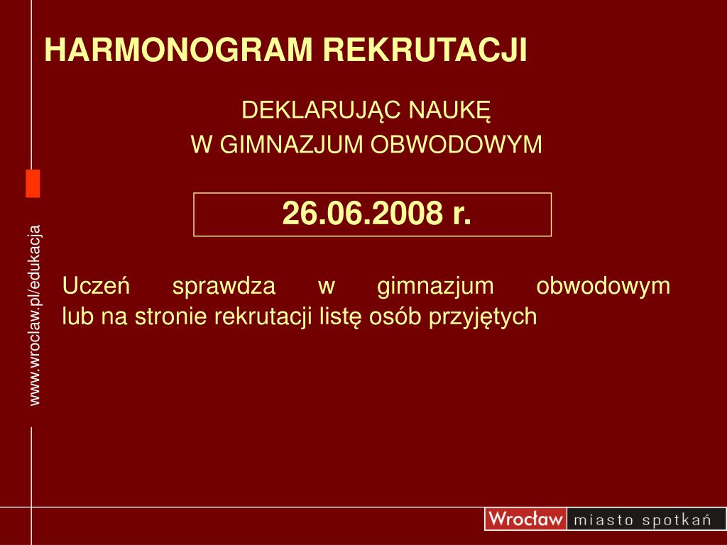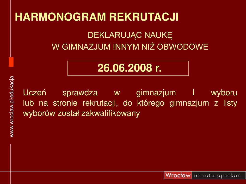 www.wroclaw.pl/edukacja HARMONOGRAM REKRUTACJI DEKLARUJĄC NAUKĘ W GIMNAZJUM INNYM NIŻ OBWODOWE Uczeń sprawdza w gimnazjum I wyboru lub na stronie rekrutacji, do którego gimnazjum z listy wyborów został zakwalifikowany 26.06.2008 r.