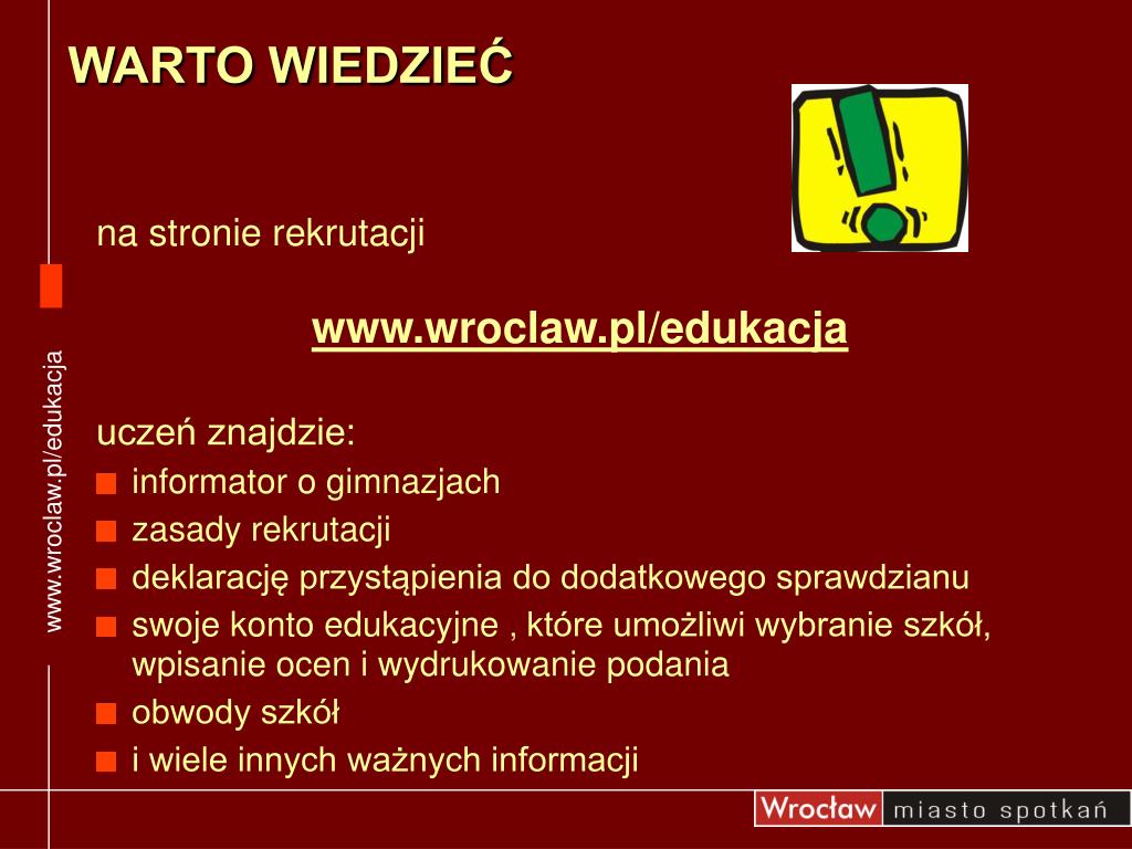 www.wroclaw.pl/edukacja WARTO WIEDZIEĆ na stronie rekrutacji uczeń znajdzie: • informator o gimnazjach • zasady rekrutacji • deklarację przystąpienia do dodatkowego sprawdzianu • swoje konto edukacyjne , które umożliwi wybranie szkół, wpisanie ocen i wydrukowanie podania • obwody szkół • i wiele innych ważnych informacji www.wroclaw.pl/edukacja
