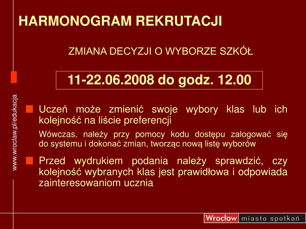 www.wroclaw.pl/edukacja HARMONOGRAM REKRUTACJI ZMIANA DECYZJI O WYBORZE SZKÓŁ 11-22.06.2008 do godz. 12.00 • Uczeń może zmienić swoje wybory klas lub ich kolejność na liście preferencji • Wówczas, należy przy pomocy kodu dostępu zalogować się do systemu i dokonać zmian, tworząc nową listę wyborów • Przed wydrukiem podania należy sprawdzić, czy kolejność wybranych klas jest prawidłowa i odpowiada zainteresowaniom ucznia