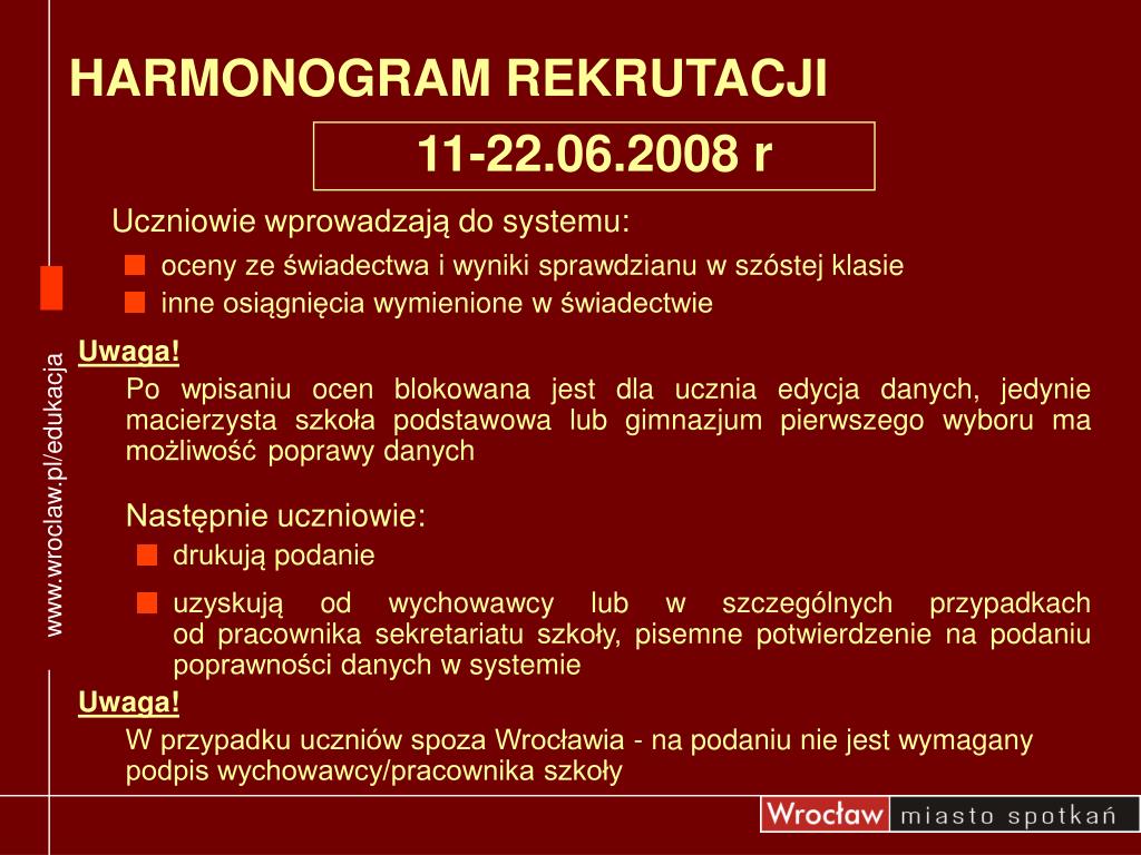 www.wroclaw.pl/edukacja HARMONOGRAM REKRUTACJI 11-22.06.2008 r Uczniowie wprowadzają do systemu: • oceny ze świadectwa i wyniki sprawdzianu w szóstej klasie • inne osiągnięcia wymienione w świadectwie Uwaga! Po wpisaniu ocen blokowana jest dla ucznia edycja danych, jedynie macierzysta szkoła podstawowa lub gimnazjum pierwszego wyboru ma możliwość poprawy danych Następnie uczniowie: • drukują podanie • uzyskują od wychowawcy lub w szczególnych przypadkach od pracownika sekretariatu szkoły, pisemne potwierdzenie na podaniu poprawności danych w systemie Uwaga! W przypadku uczniów spoza Wrocławia - na podaniu nie jest wymagany podpis wychowawcy/pracownika szkoły