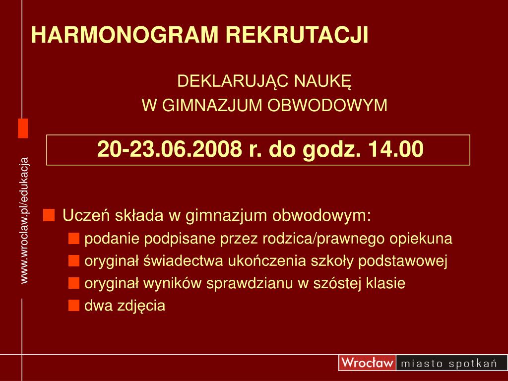 www.wroclaw.pl/edukacja HARMONOGRAM REKRUTACJI DEKLARUJĄC NAUKĘ W GIMNAZJUM OBWODOWYM Uczeń odbiera ze szkoły podstawowej: • oryginał świadectwa ukończenia szkoły podstawowej • oryginał wyników sprawdzianu w szóstej klasie 20.06.2008 r.