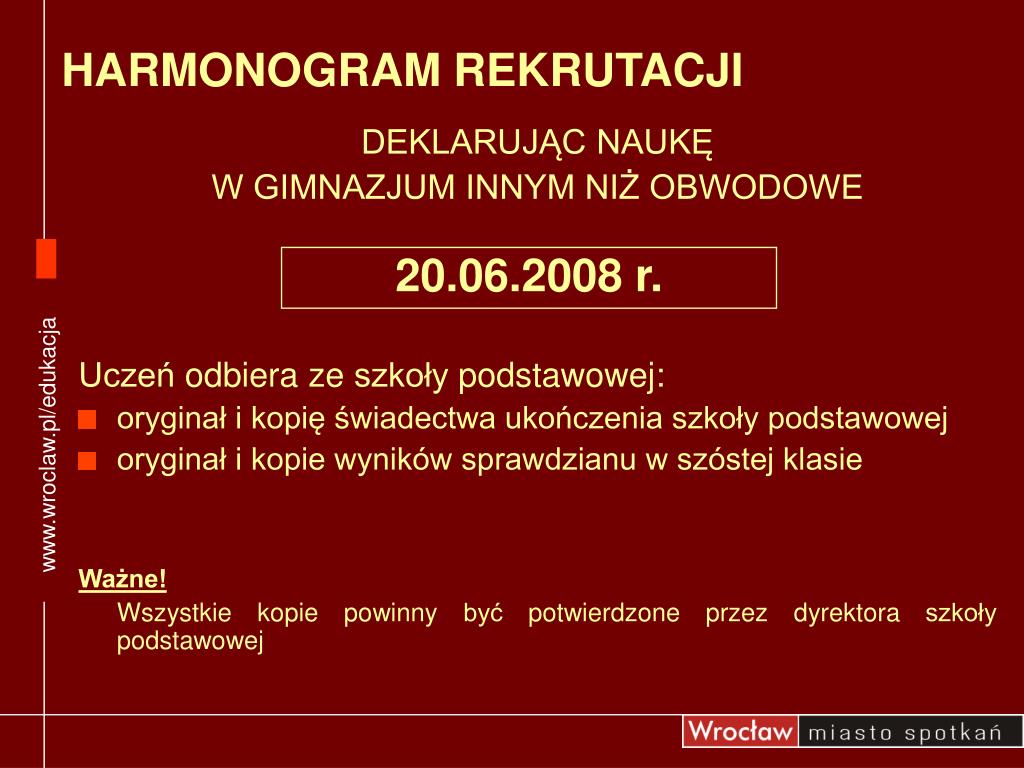 www.wroclaw.pl/edukacja HARMONOGRAM REKRUTACJI DEKLARUJĄC NAUKĘ W GIMNAZJUM INNYM NIŻ OBWODOWE Uczeń odbiera ze szkoły podstawowej: • oryginał i kopię świadectwa ukończenia szkoły podstawowej • oryginał i kopie wyników sprawdzianu w szóstej klasie Ważne! Wszystkie kopie powinny być potwierdzone przez dyrektora szkoły podstawowej 20.06.2008 r.