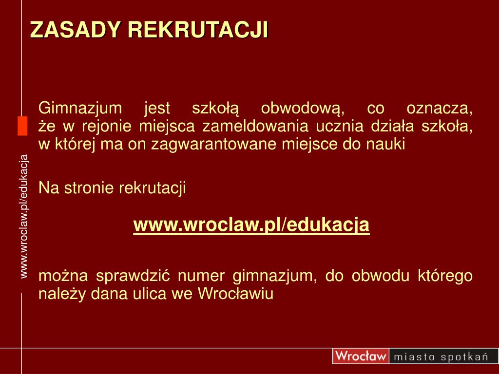 www.wroclaw.pl/edukacja ZASADY REKRUTACJI • Rekrutacja do gimnazjów odbywa się zgodnie z ogólną listą podań ułożoną wg liczby punktów rekrutacyjnych uzyskanych przez kandydatów • Mimo, że w systemie uczeń może wybrać kilka gimnazjów, to zostanie on zakwalifikowany tylko do jednego • Jeśli uczeń nie zostanie zakwalifikowany do dodatkowo wybranego gimnazjum, na pewno zostanie przyjęty do swojego gimnazjum obwodowego