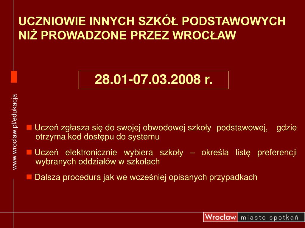 www.wroclaw.pl/edukacja UCZNIOWIE INNYCH SZKÓŁ PODSTAWOWYCH NIŻ PROWADZONE PRZEZ WROCŁAW • Uczeń zgłasza się do swojej obwodowej szkoły podstawowej, gdzie otrzyma kod dostępu do systemu • Uczeńelektronicznie wybiera szkoły – określa listę preferencji wybranych oddziałów w szkołach • Dalsza procedura jak we wcześniej opisanych przypadkach 28.01-07.03.2008 r.