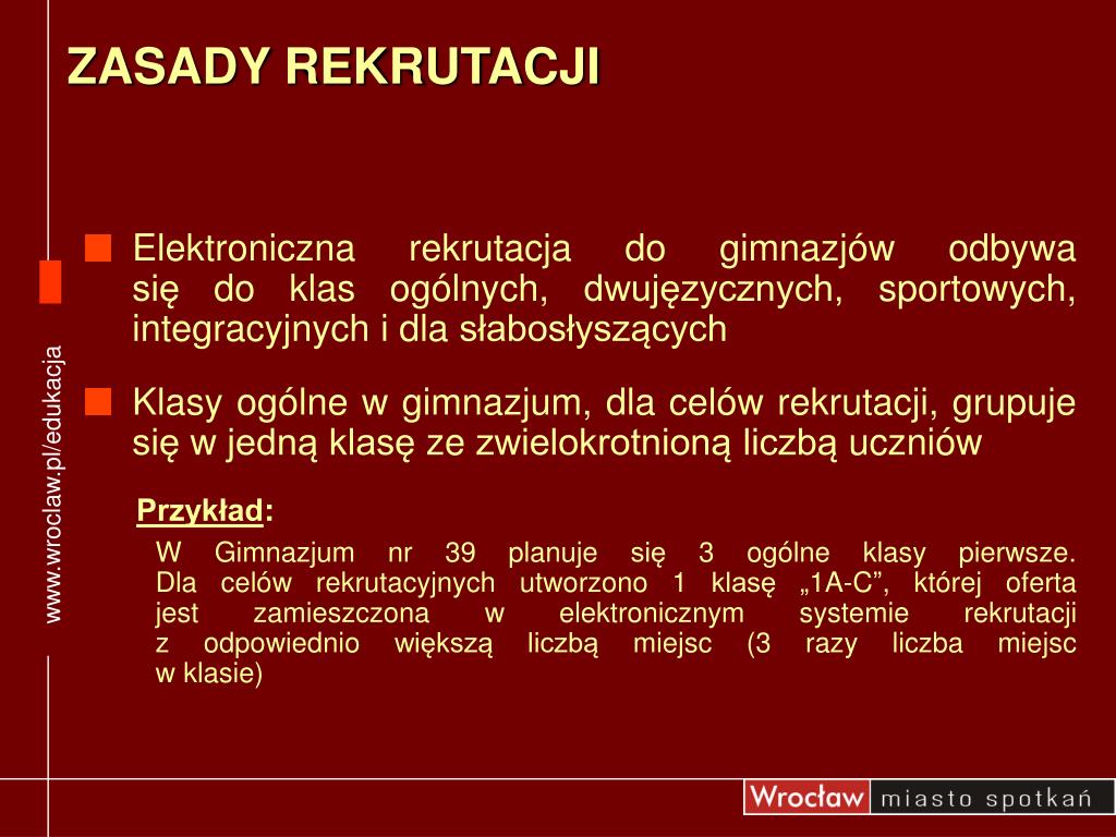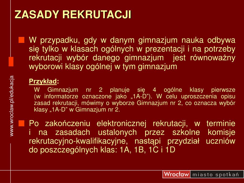 www.wroclaw.pl/edukacja ZASADY REKRUTACJI • W przypadku, gdy w danym gimnazjum nauka odbywa się tylko w klasach ogólnych w prezentacji i na potrzeby rekrutacji wybór danego gimnazjum jest równoważny wyborowi klasy ogólnej w tym gimnazjum • Przykład: • W Gimnazjum nr 2 planuje się 4 ogólne klasy pierwsze (w informatorze oznaczone jako „1A-D”). W celu uproszczenia opisu zasad rekrutacji, mówimy o wyborze Gimnazjum nr 2, co oznacza wybór klasy „1A-D” w Gimnazjum nr 2. • Po zakończeniu elektronicznej rekrutacji, w terminie i na zasadach ustalonych przez szkolne komisje rekrutacyjno-kwalifikacyjne, nastąpi przydział uczniów do poszczególnych klas: 1A, 1B, 1C i 1D